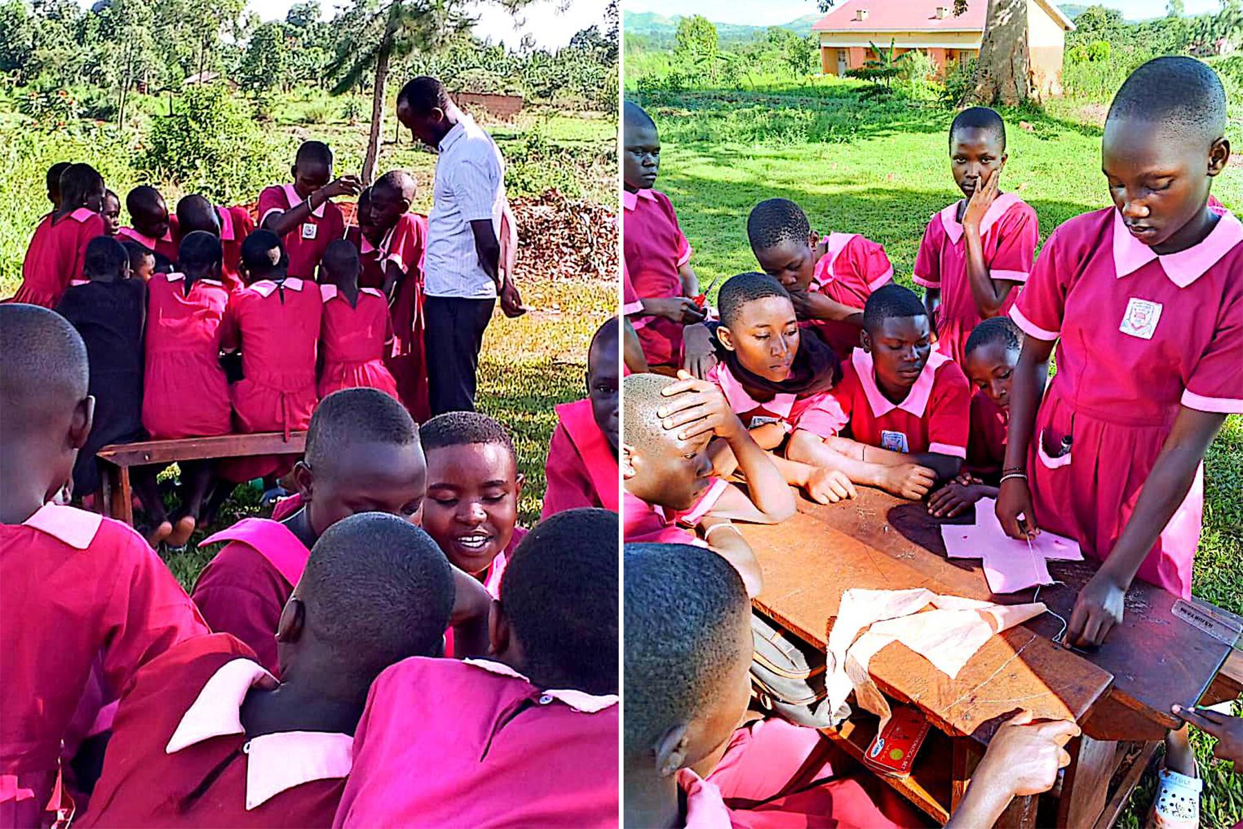 Learners at Kibugubya Primary School showcasing their skills in making reusable sanitary pads.