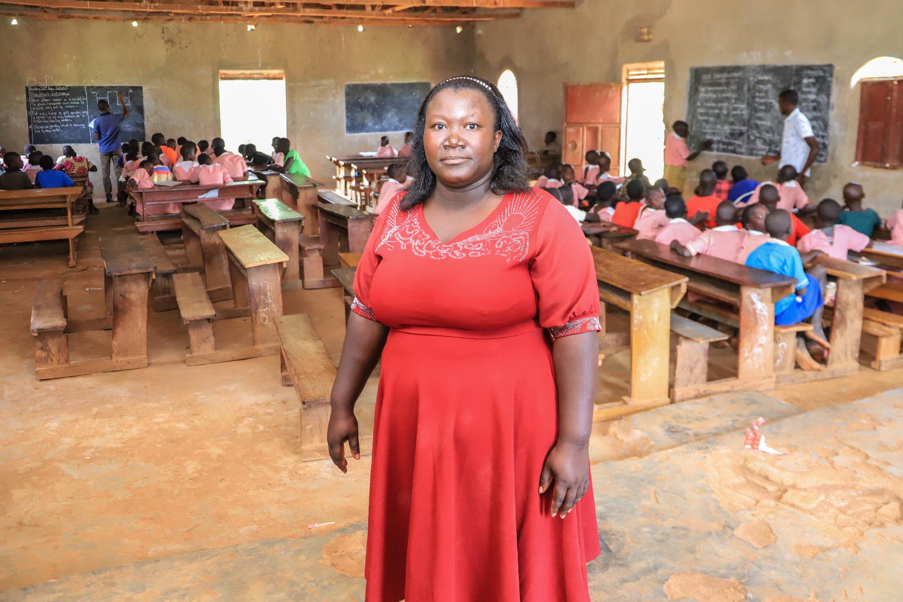 Fiona Sibihwana stands in front of the shared classroom at Kalagala Primary School, where learners from P.4, P.5, and P.6 study together due to limited classroom space.