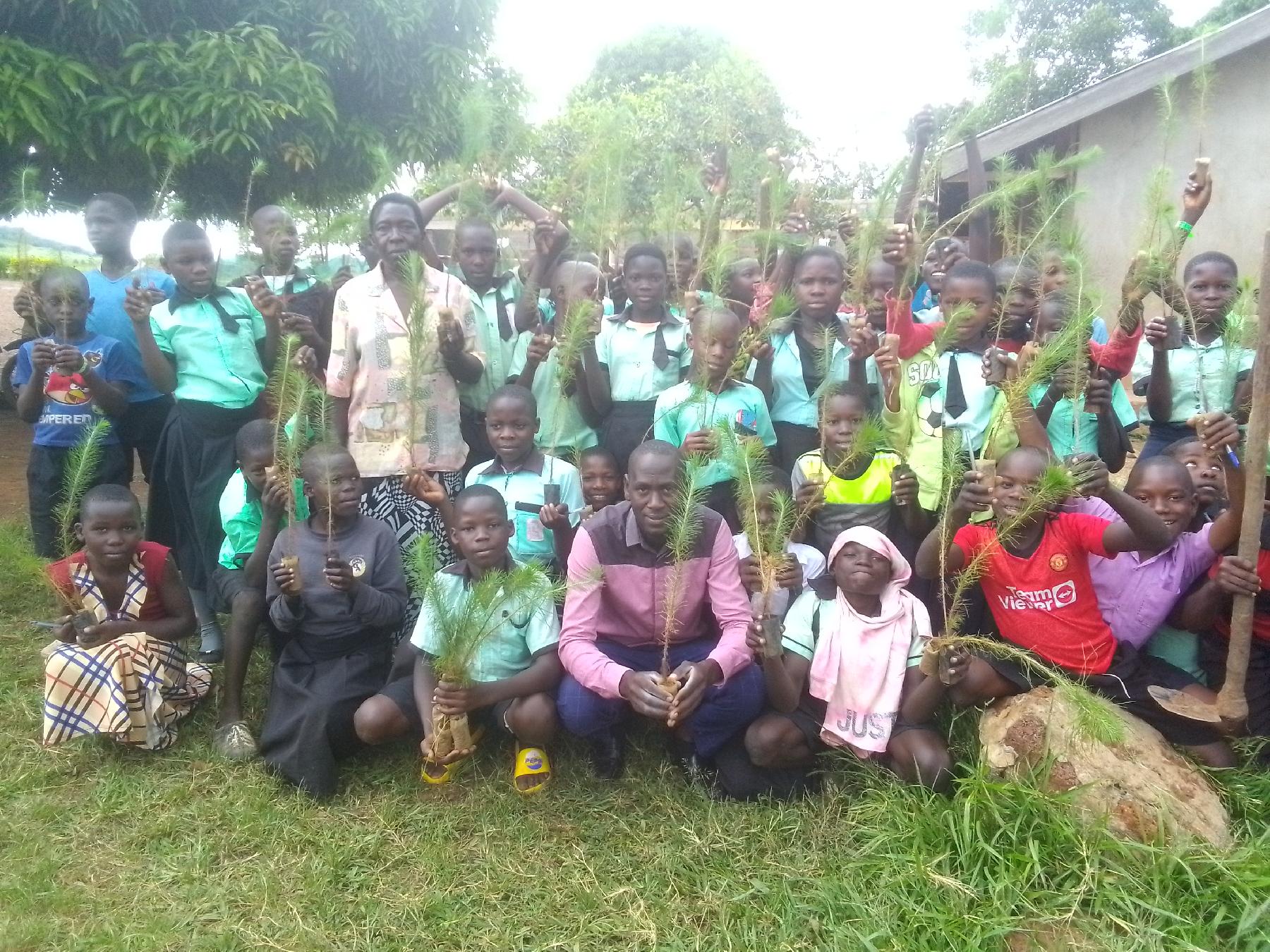 Ronald Ayebale (in a pink and black shoulder shirt) joins learners and school leaders in a vibrant tree planting activity at Katuugo Primary School, Hoima District.